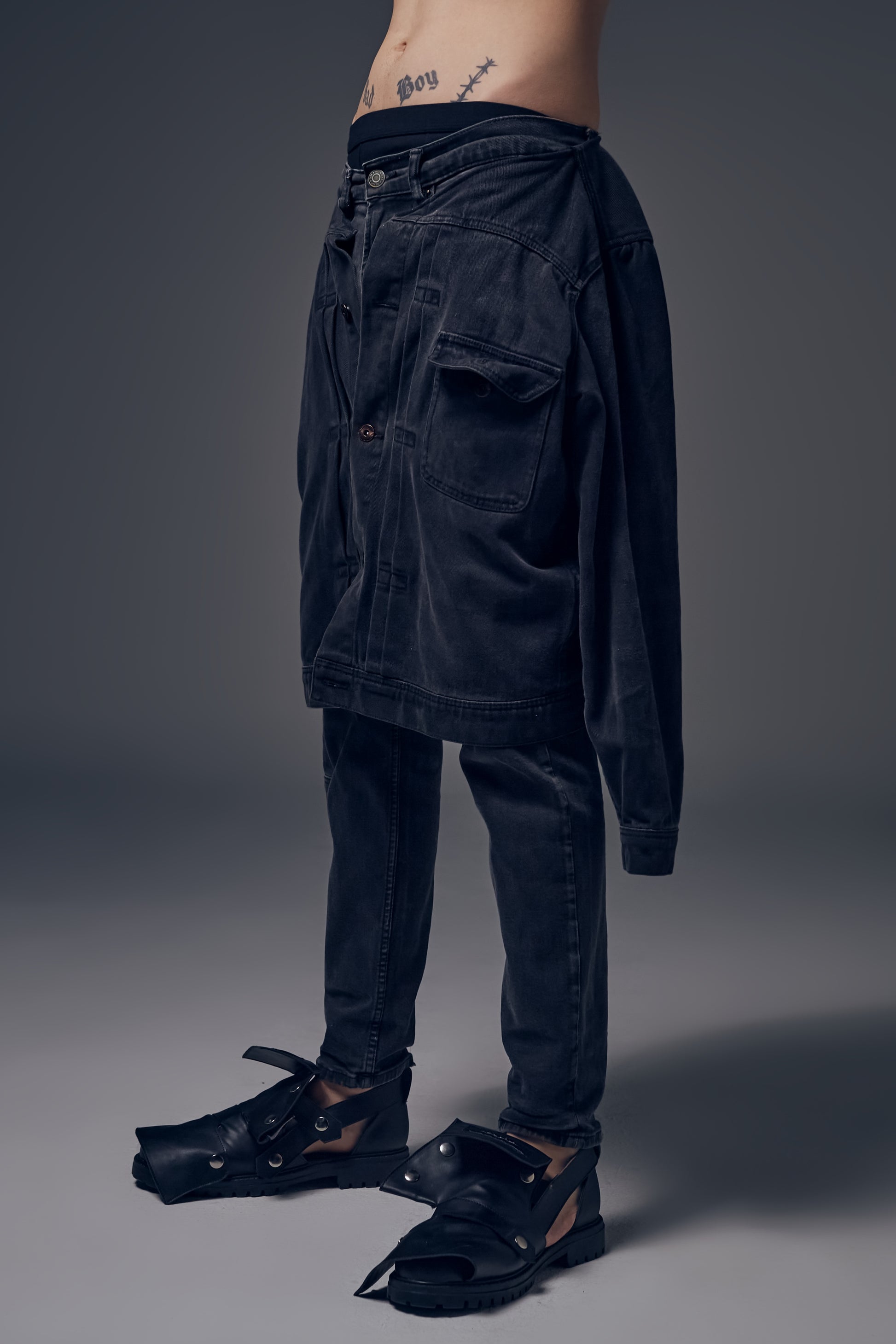 Crafted from repurposed denim, these pants blend structure with movement in a loose, grunge-inspired fit. Each piece features asymmetrical cuts and unique paneling, making every pair one of a kind.