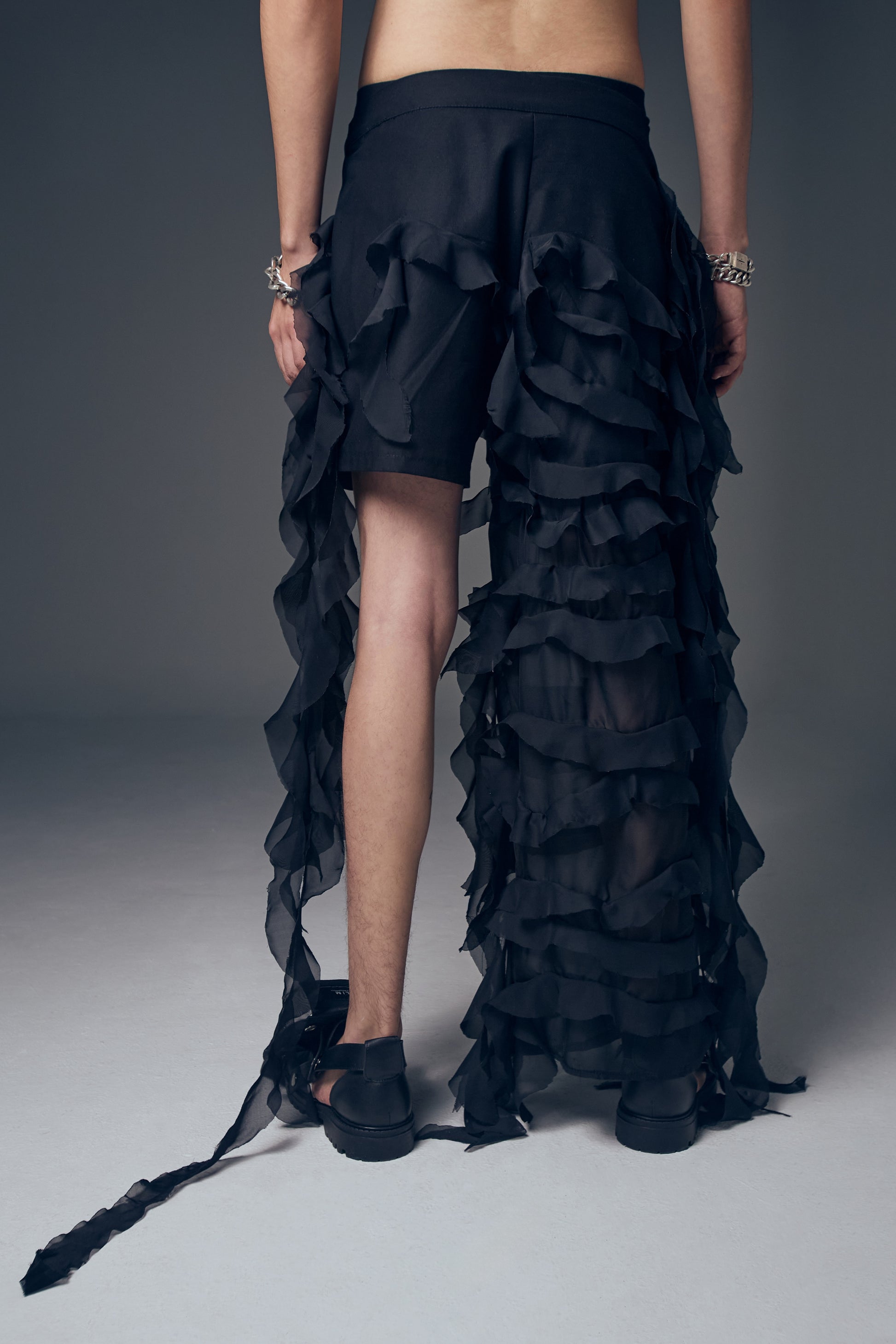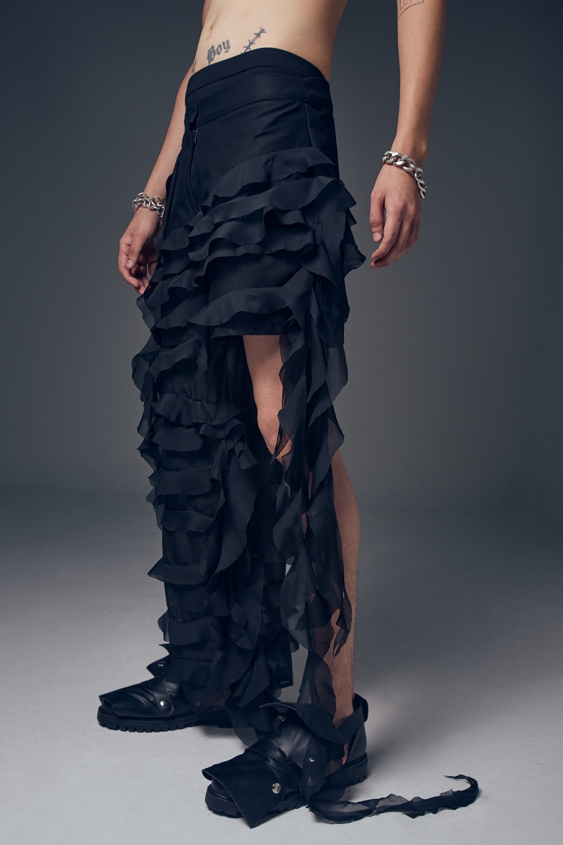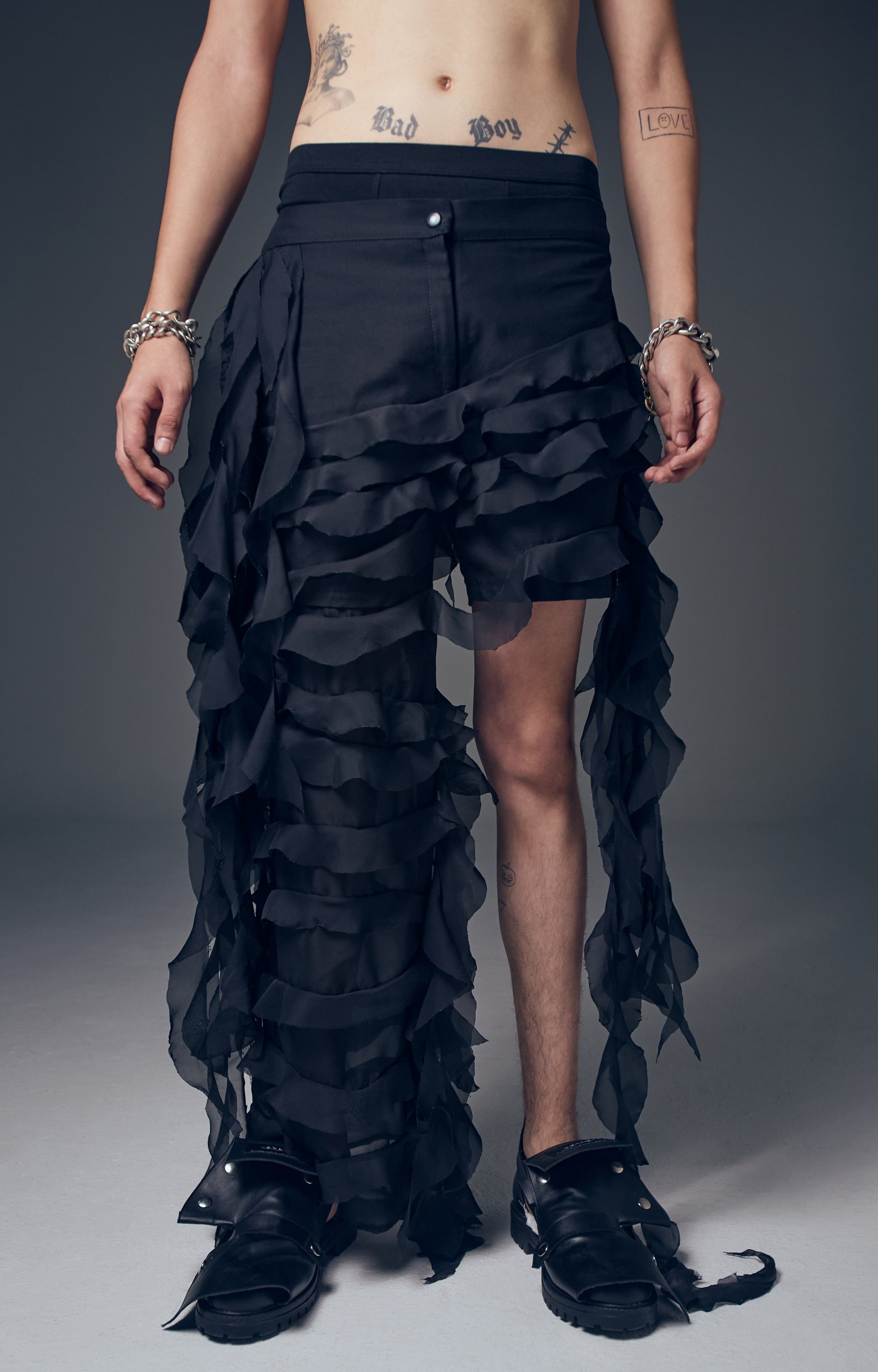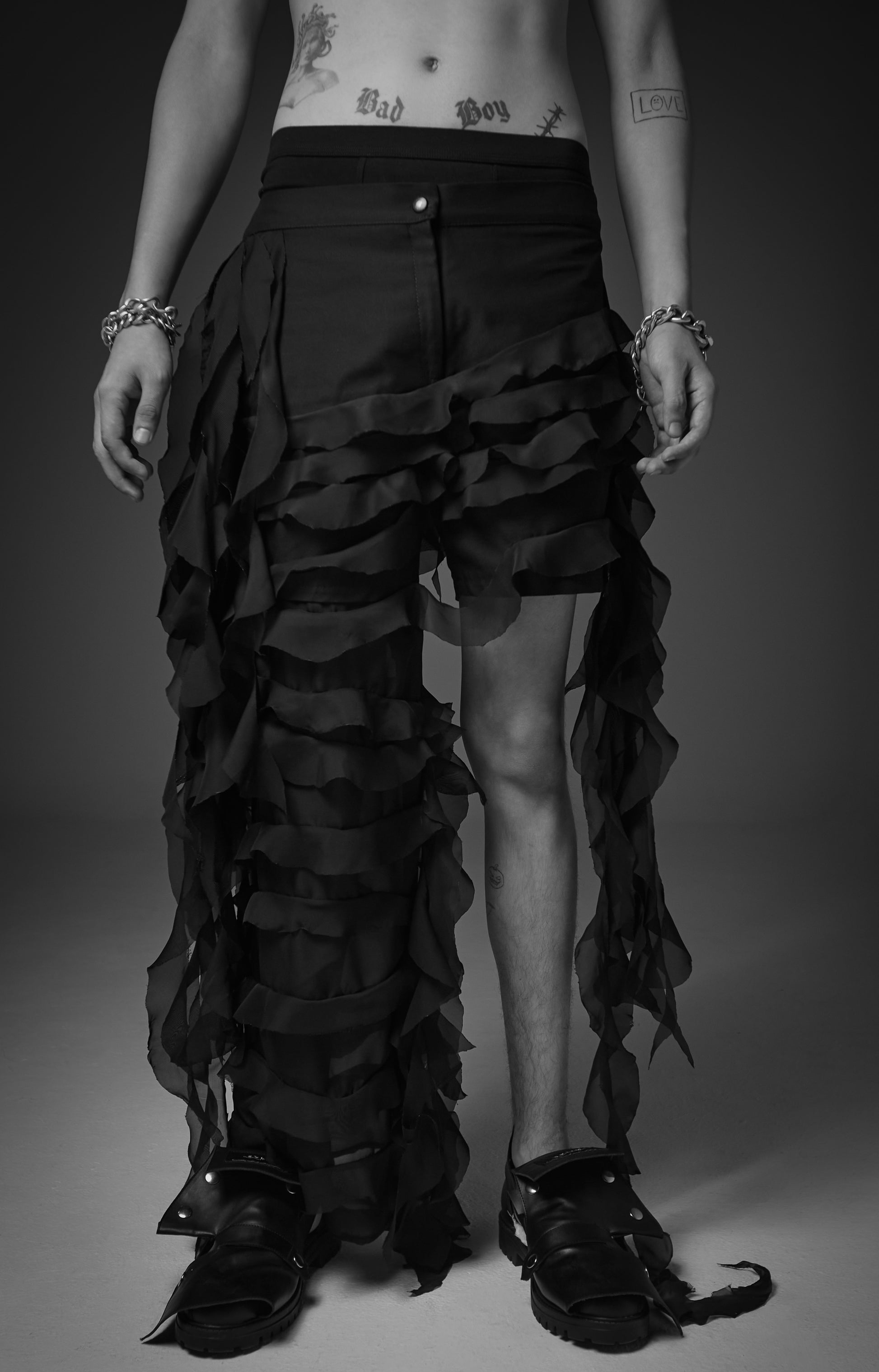 Lightweight and fluid, these trousers feature layered chiffon flares that move with effortless grace. Designed with an asymmetrical cut and a relaxed fit, each piece captures a raw yet ethereal grunge edge