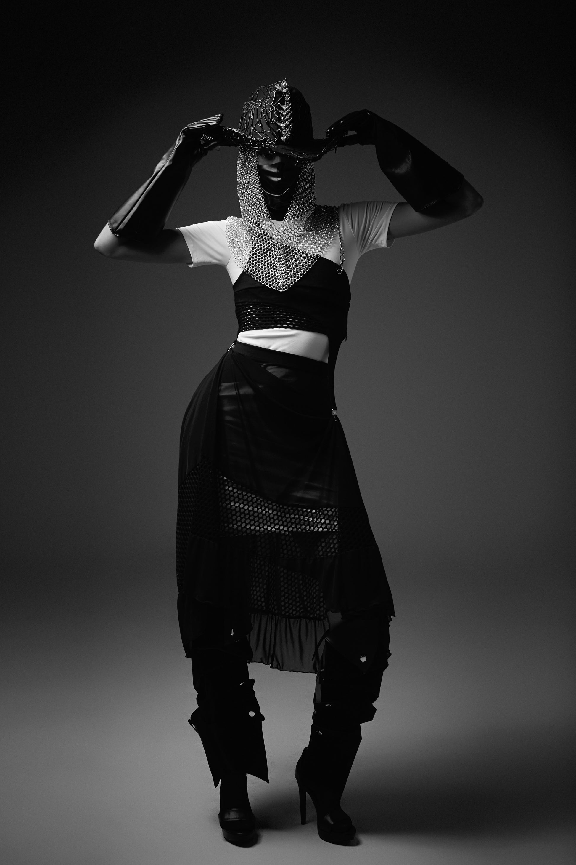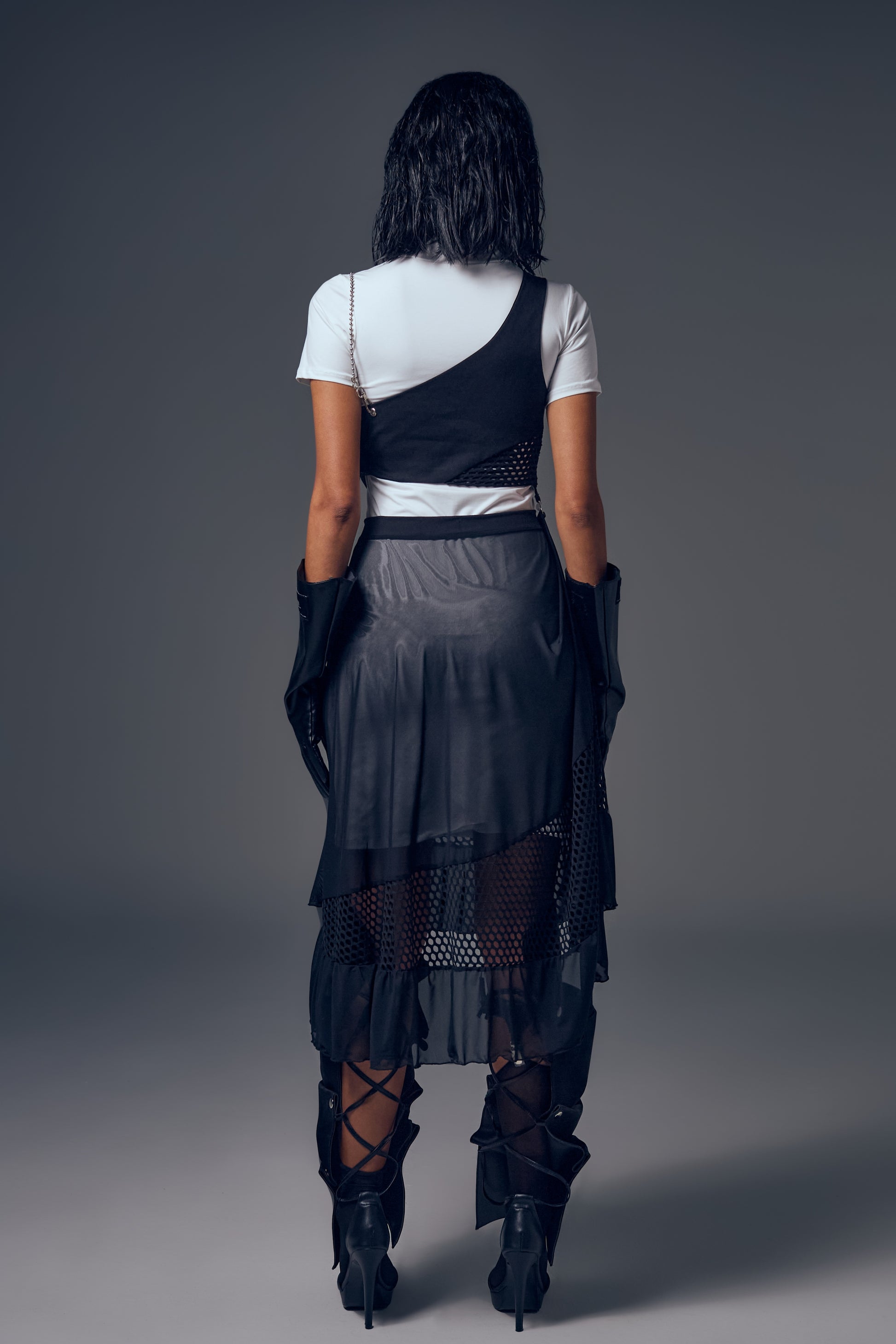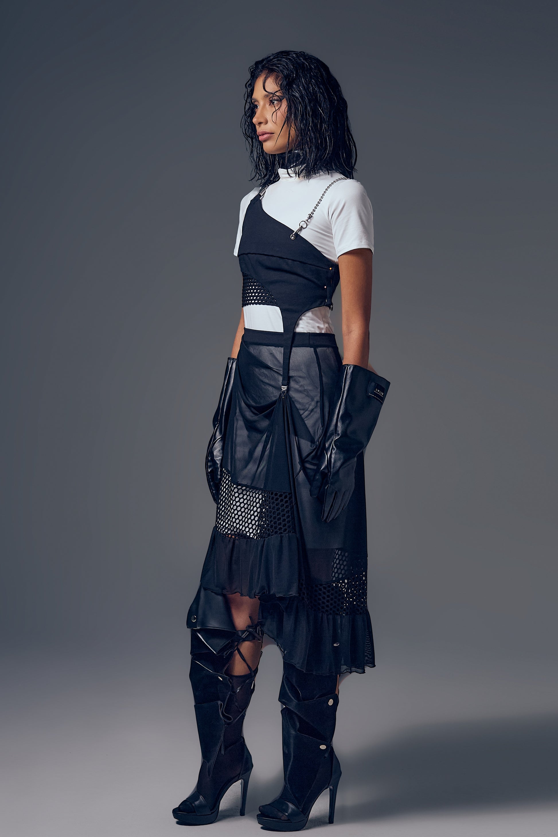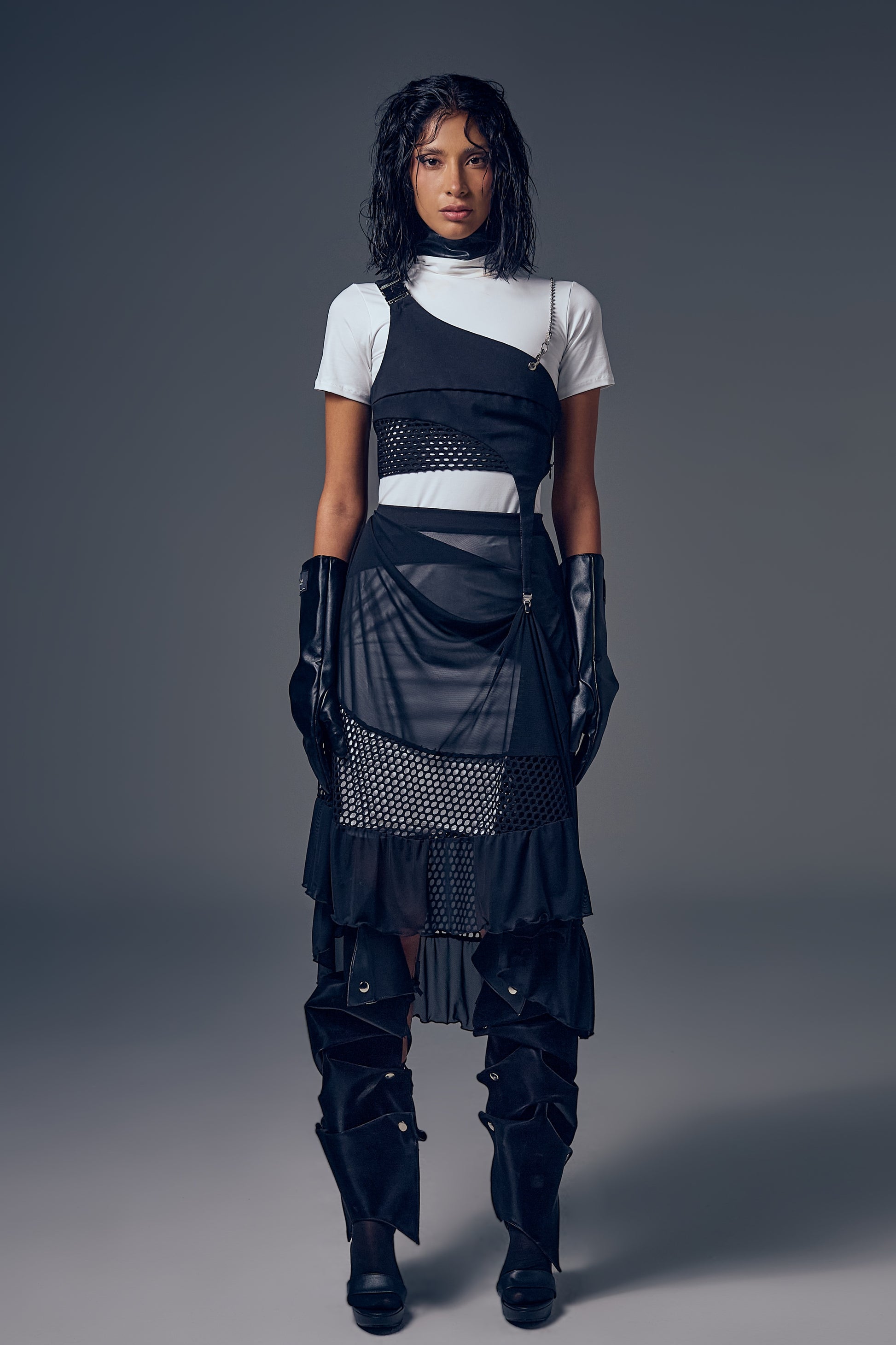 This layered three-piece set forms a unique transparent dress that allows you to create a customizable fit through draping.