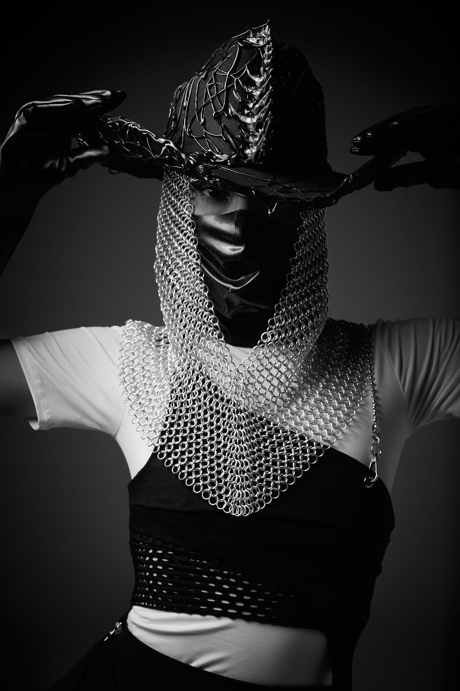 This cowboy hat is crafted from repurposed materials, 3D printing, and silicone to create drips throughout the piece. An essential statement accessory inspired by solarpunk aesthetics and posthumanism.