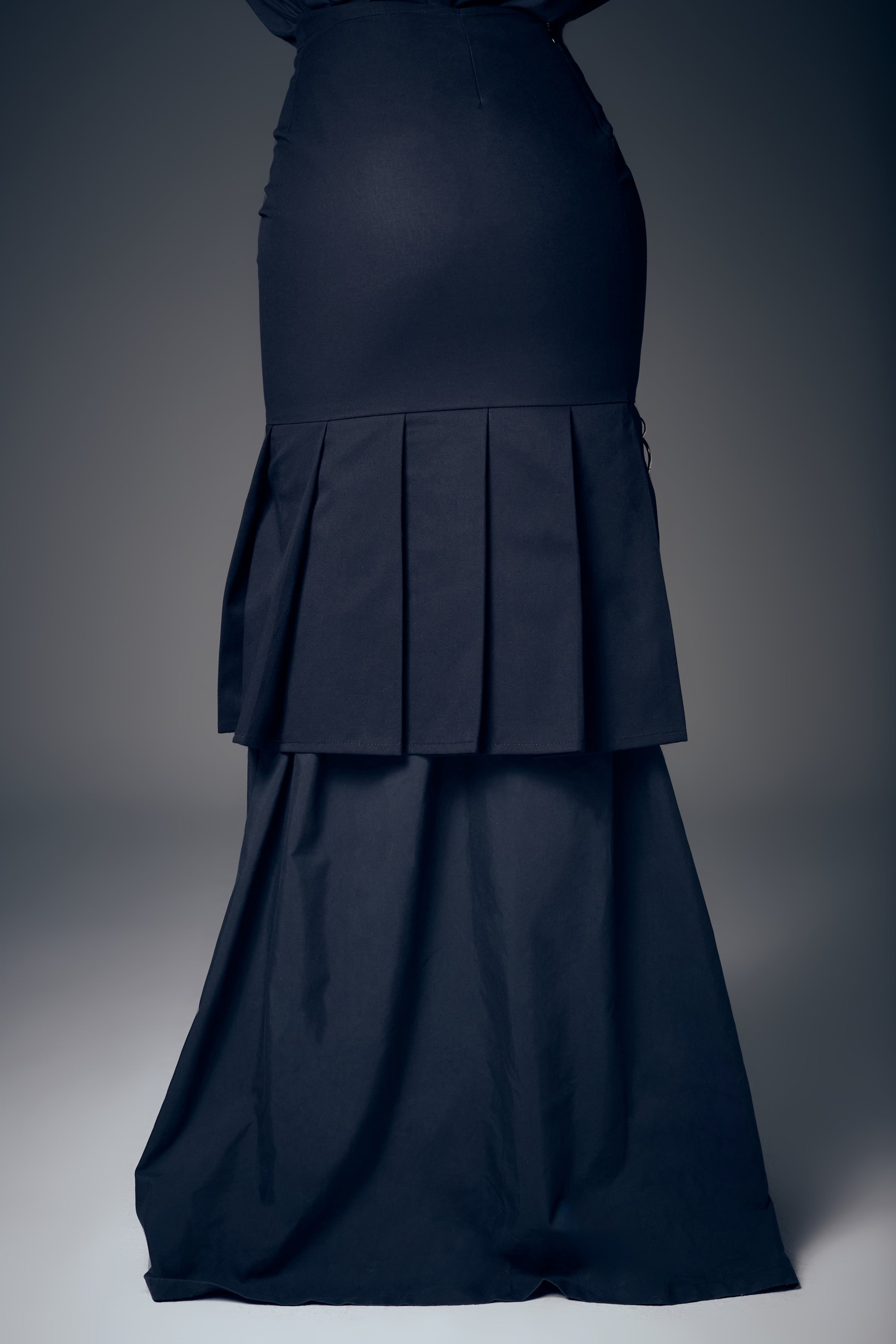 This pencil skirt is a must-have for those who love to customize their clothing. It features small loops that allow you to attach a variety of accessories — perfect for creating your own unique look. The skirt includes chains and metal rings, but does not come with the long blouse shown.